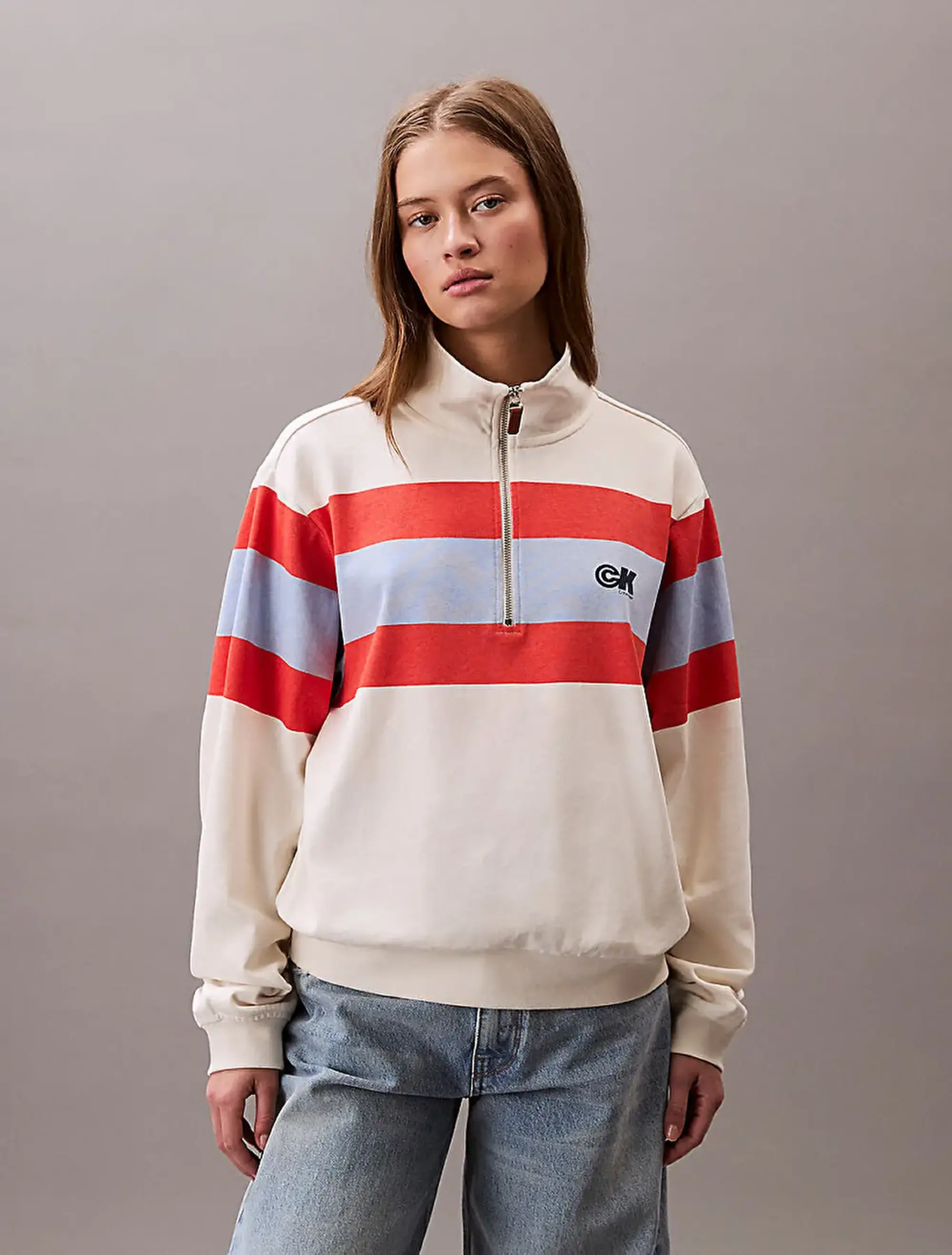 Calvin Klein RUGBY JERSEY 1/4 ZIP STRIPE TOP Bej Kadın Sweatshirt